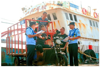 近日,浙江省舟山市公安局普陀区分局海防管理大队组织民警深入辖区码头及水产生产线,开展巡逻检查、反诈宣传,全面排查消除安全隐患,为“大开渔”营造安全、和谐的作业环境。图为民警在码头开展安全宣传。 本报记者 王春 本报通讯员 邵宇翔 摄