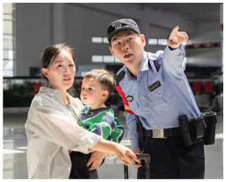 图② 为确保旅客平安有序出行,徐州铁路公安处徐州东站派出所民警节日期间坚守岗位,加强车站秩序维护。图为10月8日,民警为旅客答疑释惑。 本报通讯员 张懿丹 摄