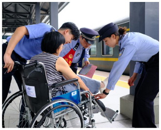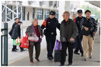 图③ 10月8日,上海铁路公安局杭州铁路公安处嘉兴车站派出所与杭州乘警支队组织民警在车站向旅客普及安全常识,并为重点旅客提供暖心服务,守护旅客返程平安。图为民警在嘉兴火车站帮助行动不便的旅客乘车。