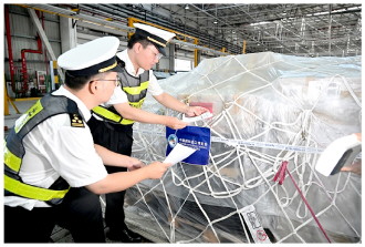 9月26日清晨7时许,第八届中国国际进口博览会(以下简称进博会)首批展品搭乘CK216航班,从德国法兰克福机场飞抵上海浦东国际机场,在上海海关所属上海浦东国际机场海关监管保障下顺利通关,标志着本届进博会展品通关工作正式拉开帷幕。本届进博会将于11月5日至10日在上海举办。上海海关将对标一流服务保障要求,进一步优化便利措施、提升科技赋能、扩大制度创新,推动进博会海关监管服务保障水平再上新台阶,助力更多全球企业共享中国大市场。图为关员对第八届进博会首批入境展品开展监管。