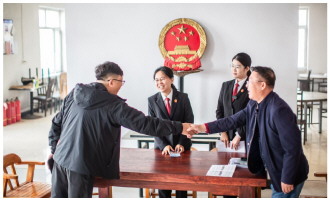 近日,吉林省四平市铁西区人民法院法官走进四平某农机公司,将食堂设为“临时法庭”,现场化解一起标的额为360余万元的农机买卖合同纠纷案件。图为双方当事人在法官见证下握手言和。 本报通讯员 费季为 任青阳 摄
