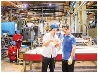 ▲ 近日,国网丽水供电公司组织共产党员服务队,走进浙江省丽水市缙云县新碧工业园区,开展安全用电专项检查。图为服务队队员向某企业生产车间负责人介绍分布式光伏项目运营方案。 楼拓斌 摄
