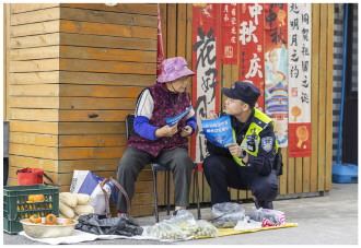 近日,上海市公安局崇明分局建设派出所民警来到辖区集市开展反诈宣传。图为民警向摆摊的商户宣讲防范电信网络诈骗知识。 本报通讯员 沈群 施大为 摄