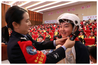 近日,江苏省扬州市公安局交通管理支队民警来到辖区学校,开展“红黄绿”交通安全宣传进乡村活动。图为民警现场演示头盔的佩戴方法。