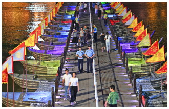 图① 10月23日晚,浙江省义乌市公安局佛堂派出所民警在辖区网红桥——“万善浮桥”上维持秩序、服务游客。