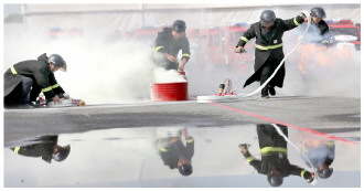 近日,江苏省南通市通州区举行2025年消防宣传月启动仪式暨镇(街道)消防快速处置队比武竞赛活动。各镇(街道)分别选派1支村(社区)消防快速处置队与1支居民住宅小区消防快速处置队参赛。竞赛设置微型消防车出水打靶、手抬泵吸水排涝、油盆灭火三大实操项目,全面检验参赛队伍的实战处置能力。图为竞赛现场。 本报通讯员 许丛军 摄