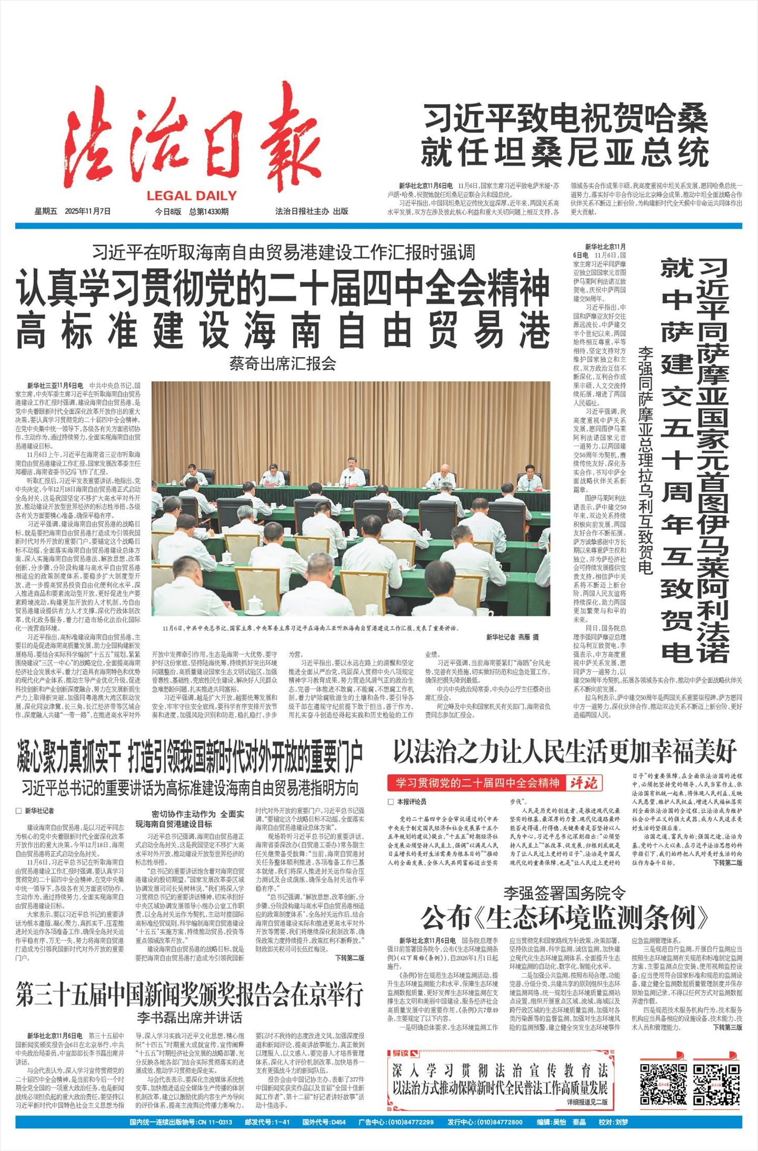 11月6日,习近平总书记在听取海南自由贸易港建设工作汇报时强调,要认真学习贯彻党的二十届四中全会精神,在党中央集中统一领导下,各级各有关方面密切协作、主动作为,通过持续努力,全面实现海南自由贸易港建设目标。