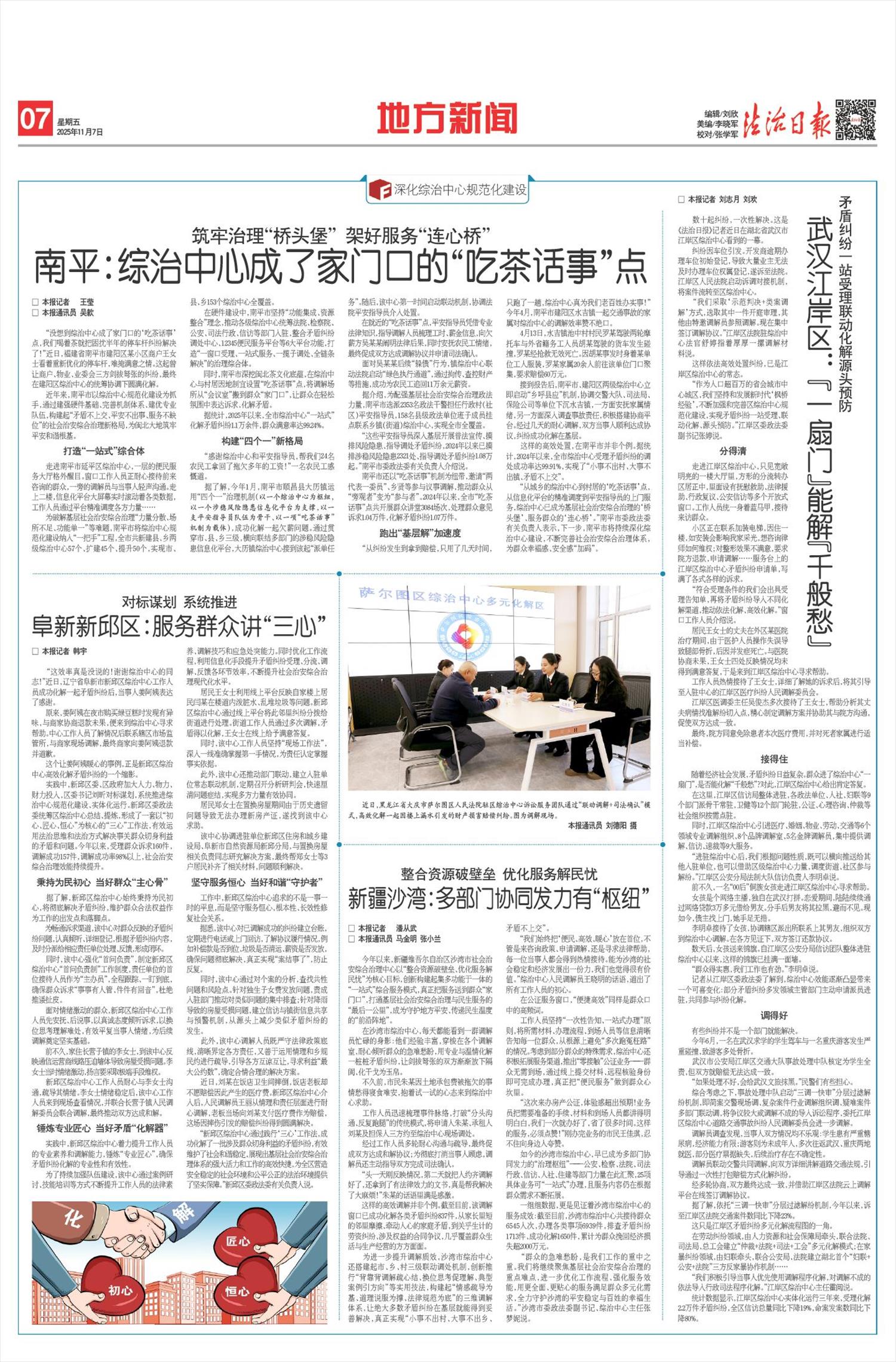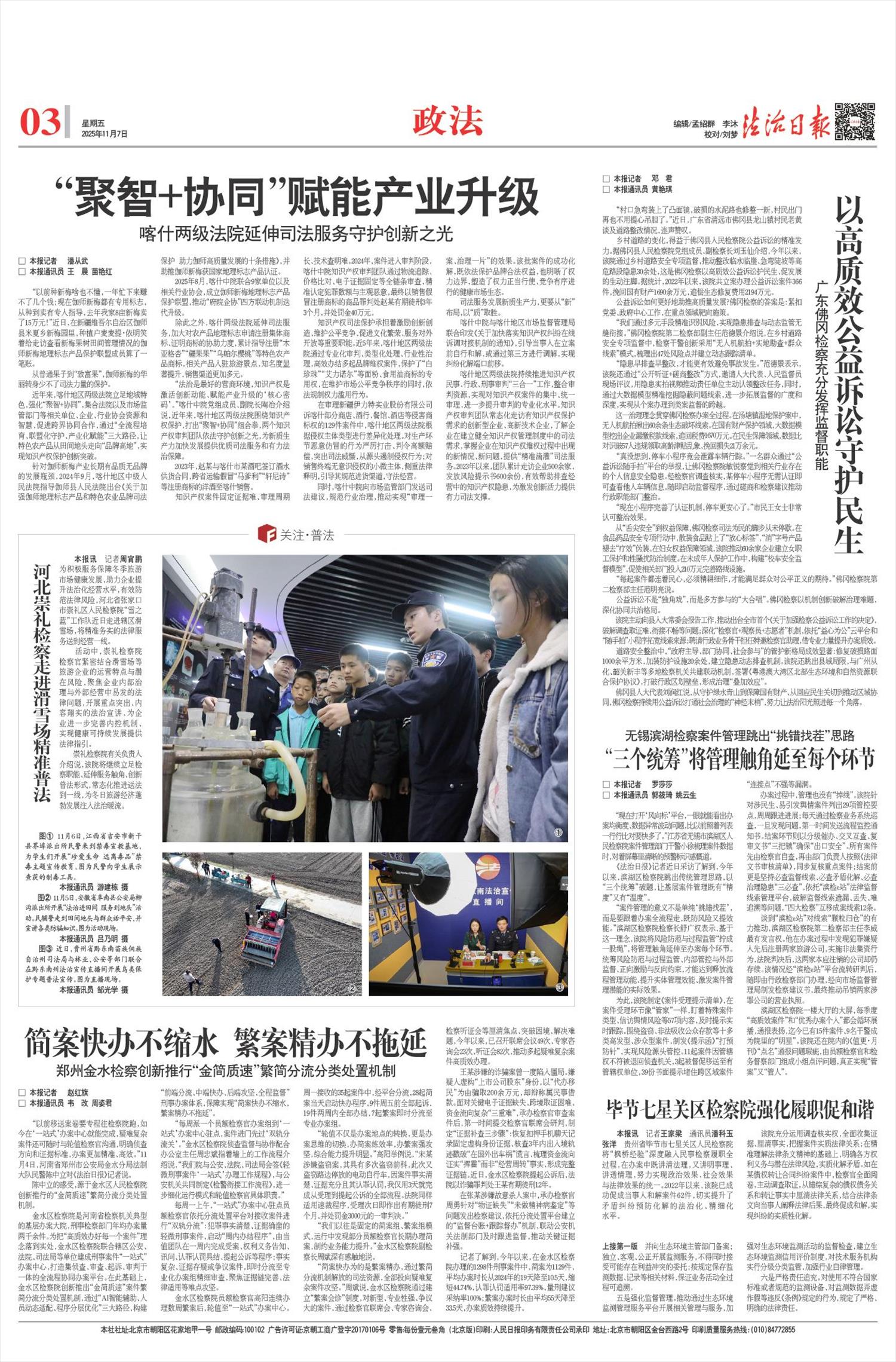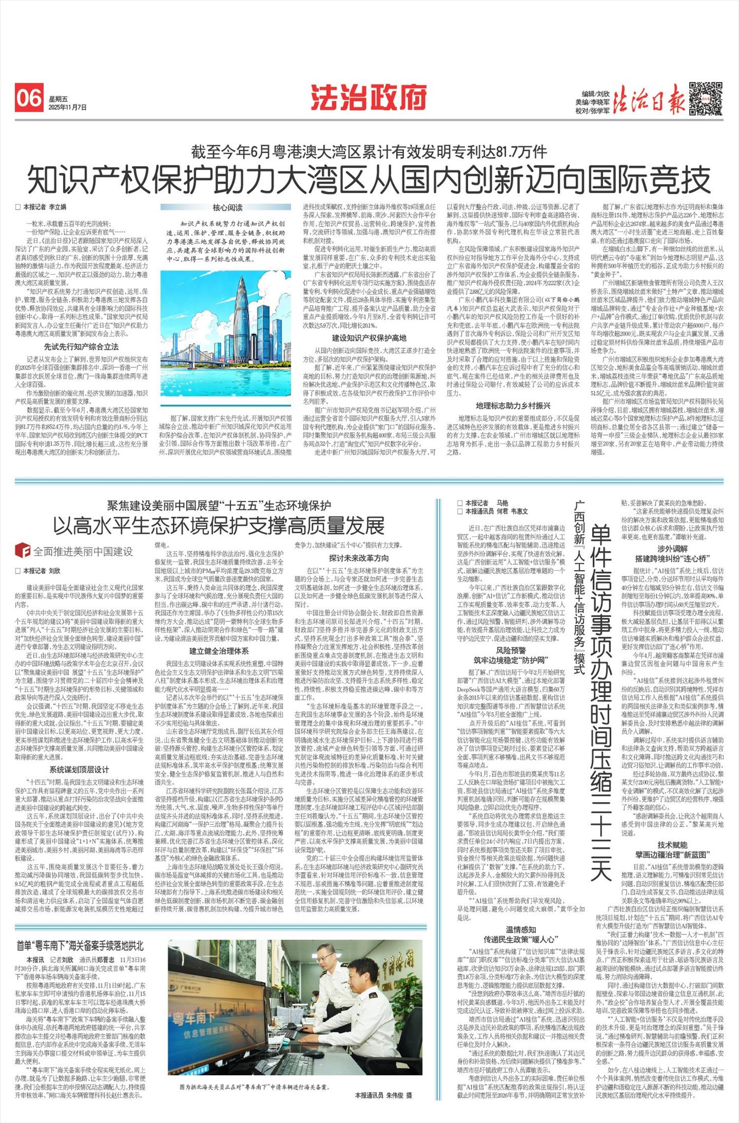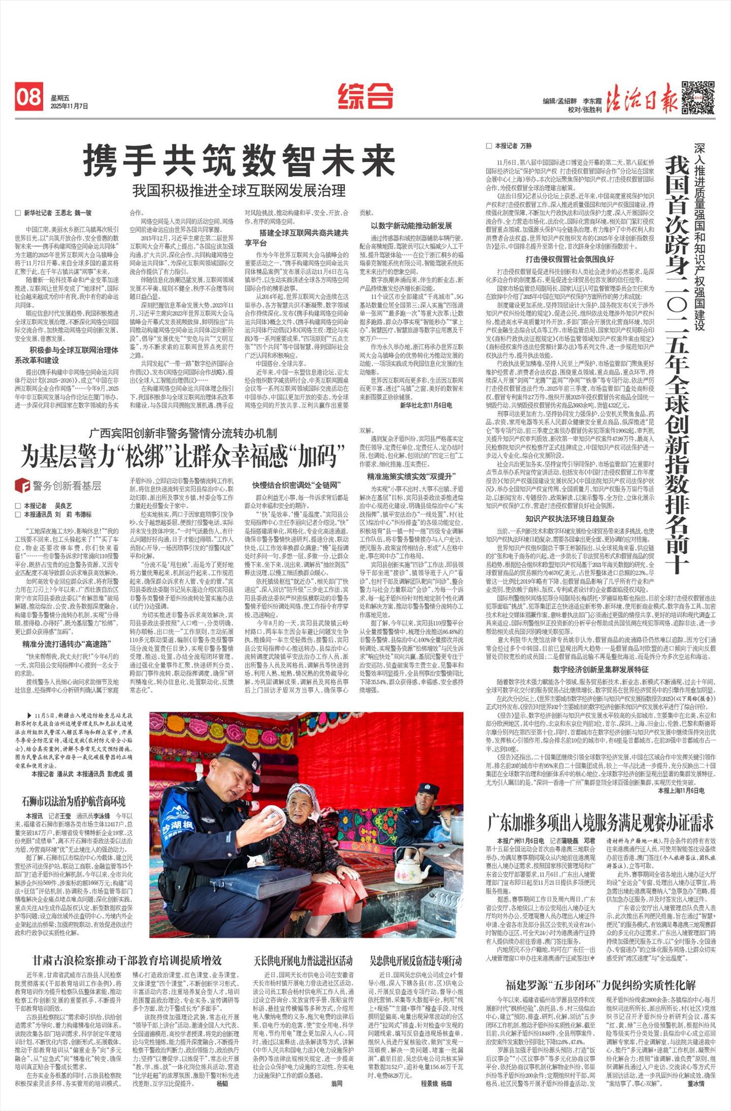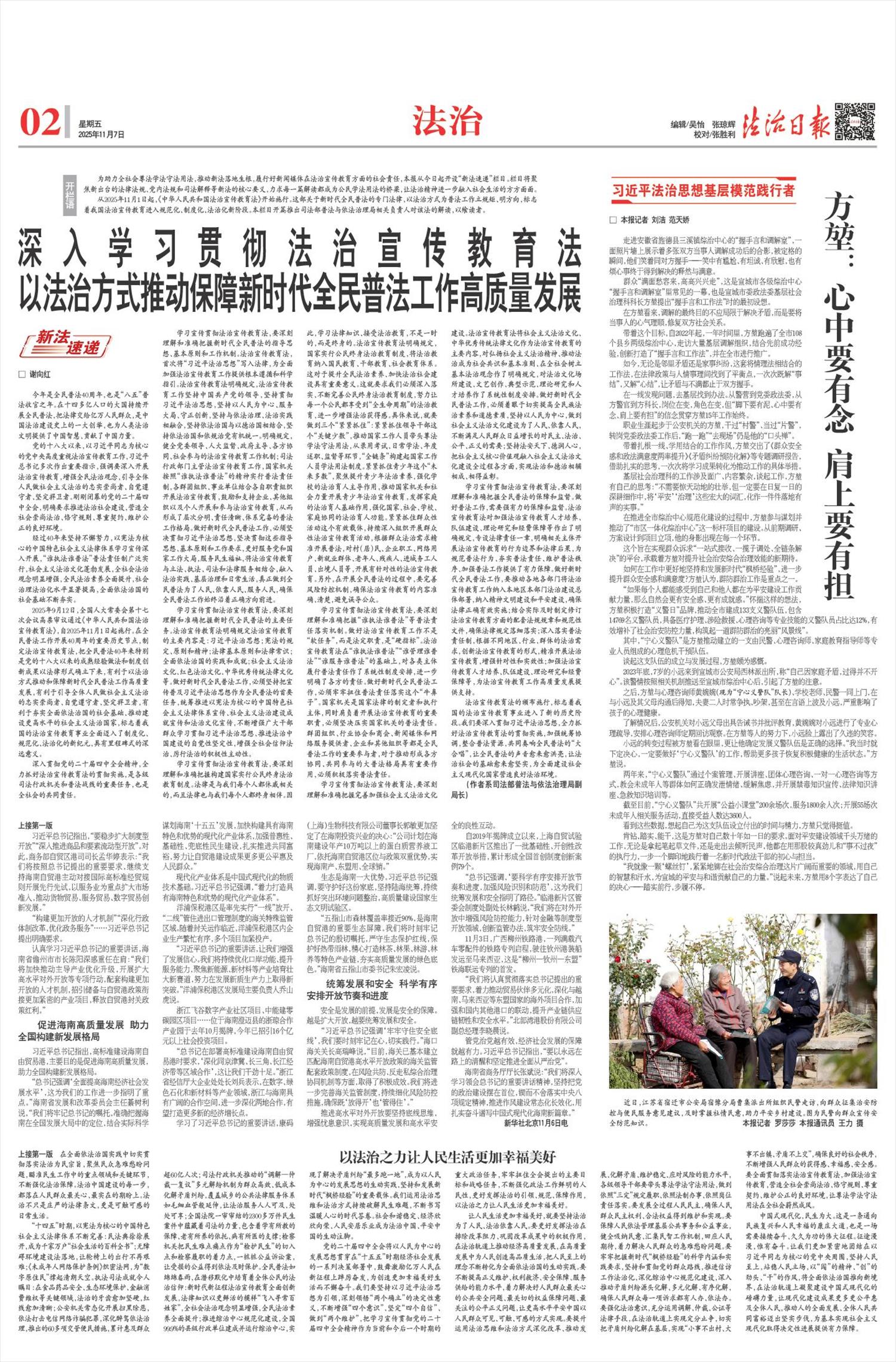 “十四五”时期,以宪法为核心的中国特色社会主义法律体系不断完善:民法典徐徐展开,成为千家万户“社会生活的百科全书”;无障碍环境建设法落地,让轮椅上的出行不再艰难;《未成年人网络保护条例》织密法网,为“数字原住民”撑起清朗天空。执法司法成就令人瞩目:在食品药品安全、生态环境保护、金融消费维权等关键领域,法治的牙齿愈加坚硬,红线愈加清晰;公安机关常态化开展扫黑除恶,依法打击电信网络诈骗犯罪,深化醉驾依法治理,推出的60多项交管便民措施,累计惠及群众超60亿人次;司法行政机关推动的“调解—仲裁—复议”多元解纷机制为群众高效、低成本化解矛盾纠纷,覆盖城乡的公共法律服务体系如毛细血管般延伸,让法治服务人人可及、处处可享;全国法院一审审结的2300多万件民生案件中蕴藏着司法的力量,包含着学有所教的保障、老有所养的依托、病有所医的支撑;检察机关把民生难点痛点作为“检护民生”的切入点和检察履职的着力点,一桩桩公益诉讼案,让受损的公益得到依法及时保护。全民普法如绵绵春雨,在潜移默化中培育着全体公民的法治信仰:新时代新征程法治宣传教育全面创新发展,法律知识以更鲜活的模样“飞入寻常百姓家”,全社会法治观念明显增强,全民法治素养全面提升;推进综治中心规范化建设,全国99.9%的县级行政单位建成并运行综治中心,实现了解决矛盾纠纷“最多跑一地”,成为以人民为中心的发展思想的生动实践、坚持和发展新时代“枫桥经验”的重要载体。我们运用法治思维和法治方式持续破解民生难题,不断书写温暖人心的时代答卷。社会和谐稳定、经济欣欣向荣、人民安居乐业成为法治中国、平安中国的生动注脚。