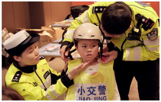 近日,江苏省太仓市公安局交警大队开展“交通安全主题餐厅”体验日活动。活动中,交警以寓教于乐的形式,在交通安全主题餐厅为孩子们讲解交通安全知识。图为民警教小朋友佩戴安全头盔。