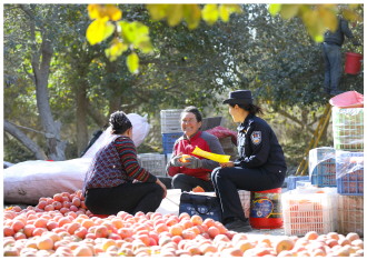 近日,新疆维吾尔自治区叶城县夏合甫乡派出所组织警力深入田间地头,在助力果农丰收的同时,开展防范非法集资、电信网络诈骗宣传。图为民警向果农普及反诈知识。 本报记者 潘从武 本报通讯员 程超 摄
