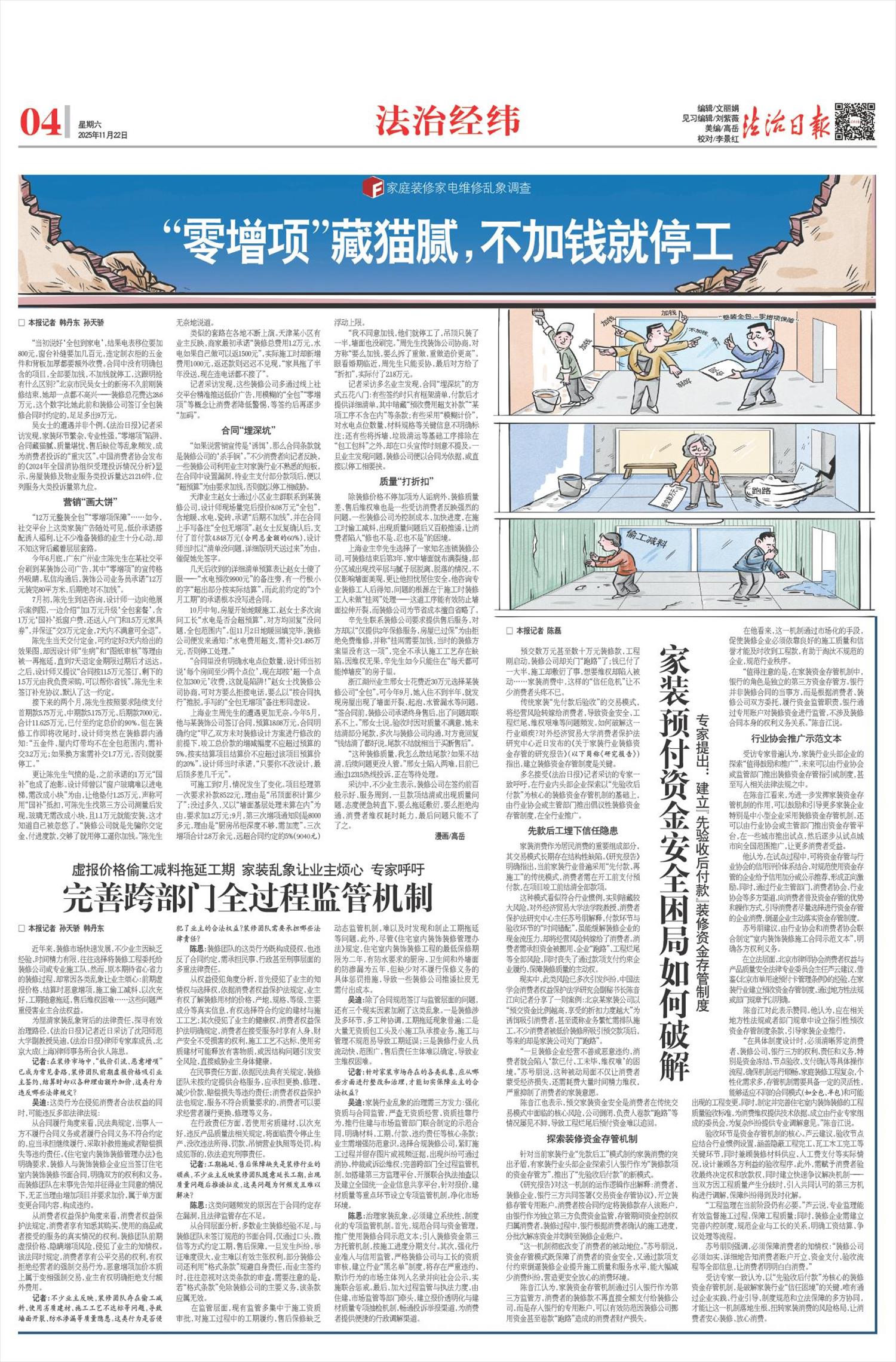 现实中,此类风险已多次引发纠纷。中国法学会消费者权益保护法学研究会副秘书长陈音江向记者分享了一则案例:北京某家装公司以“预交资金比例越高,享受的折扣力度越大”为诱饵吸引消费者,甚至谎称业务繁忙需排队施工。不少消费者被低价装修所吸引预交款项后,等来的却是家装公司关门“跑路”。