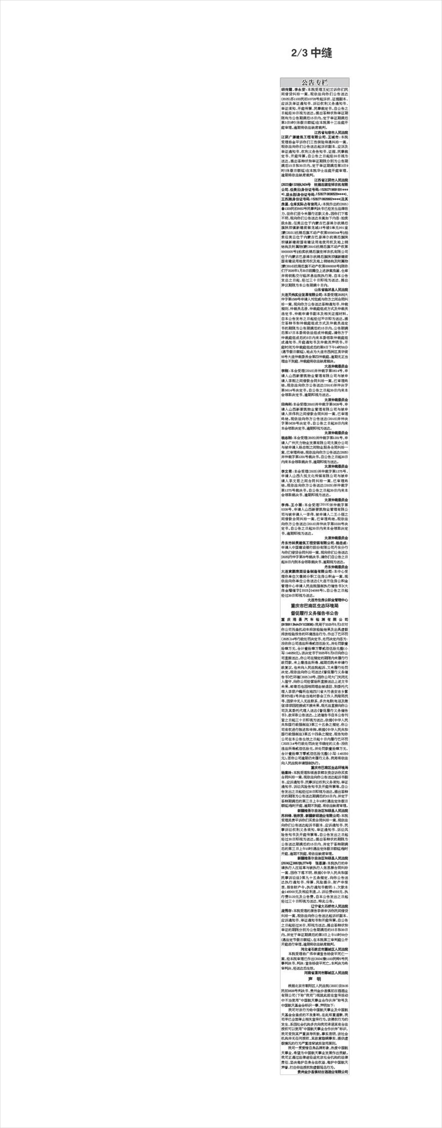 公告专栏   胡传霞、李永安:本院受理王纪兰诉你们民间借贷纠纷一案,现依法向你们公告送达(2025)苏1183民初10728号起诉状、证据副本、应诉及举证通知书、诉讼权利义务通知书、举证须知、开庭传票、民事裁定书。自公告之日起经30日视为送达。提出答辩状和举证期限均为公告期满后15日内。定于举证期满后第3日9时(休假日顺延)在本院第十三法庭开庭审理。逾期将依法缺席裁判。