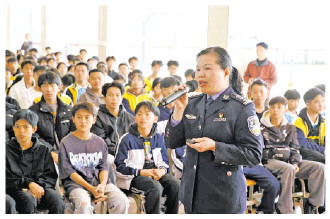 图为广东省肇庆市广宁县公安局副局长曾惠容在江屯中学开展法治副校长进校园宣讲活动。 广宁县委政法委供图