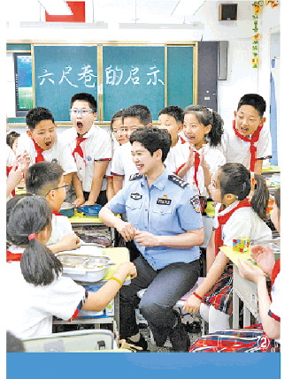 距离警务室100多米的船营区第二十五小学西校区,张野和孩子们一边吃饭一边用最近发生的新鲜事给孩子们讲普法小故事。