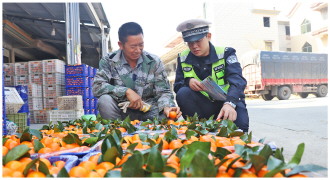 近日,江西省南丰县公安局交管大队组织民辅警开展“桔园警务”,通过走乡村、进果园,向桔农宣传道路交通安全法律法规,并帮助桔农解决实际困难。图为“桔园警务”小分队队员来到辖区市山镇坪埠村与农户聊家常、话安全。 本报记者 黄辉 本报通讯员 曾知英 刘方飞 摄