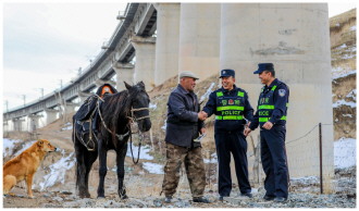 近日,乌鲁木齐铁路公安局奎屯公安处伊宁站派出所民警深入辖区铁路沿线牧区,巡检线路,排查隐患,向牧民宣传铁路安全知识,筑牢铁路安全防线。图为民警向牧民普及铁路安全知识。 本报记者 潘从武 本报通讯员 布克呼宜格 摄