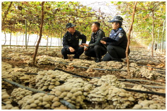11月25日,山东省济南市公安局市中分局党家派出所组织民辅警深入辖区农场,开展普法宣传。图为民辅警在蘑菇种植大棚里,向村民讲解农产品销售合同中的法律知识。 本报通讯员 郝鑫城 摄