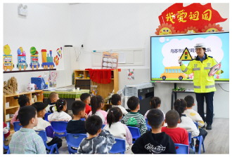近日,新疆维吾尔自治区乌苏市委政法委牵头市公安局、司法局等部门,共同走进乌苏市第七幼儿园,开展普法宣传活动。图为乌苏市公安局交警大队辅警向小朋友讲解交通标志知识。
