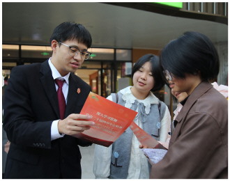 在第十二个“国家宪法日”到来之际,福建省三明市三元区人民法院组织法官深入辖区,以“诚信点亮生活 法治护航未来”为主题开展普法宣传活动。图为干警从宪法伴一生的角度,引导青少年尊崇宪法、学习法律。