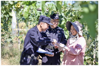 近日,广西壮族自治区合浦县公安局围绕“保农、护农、安农”目标,将警务服务主动延伸至田间地头,组织警力下沉一线开展“助农护收”专项行动,全力守护农户“粮袋子”与“钱袋子”。图为合浦县公安局党江派出所民警向农户普及反诈知识。