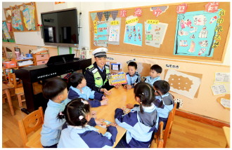 ▲ 近日,江西省分宜县公安局交管大队组织民辅警走进辖区校园,通过以案说法、互动体验、趣味问答等方式,向学生普及“一盔一带”交通安全知识。图为民警在县中心幼儿园向小朋友讲解交通安全知识。