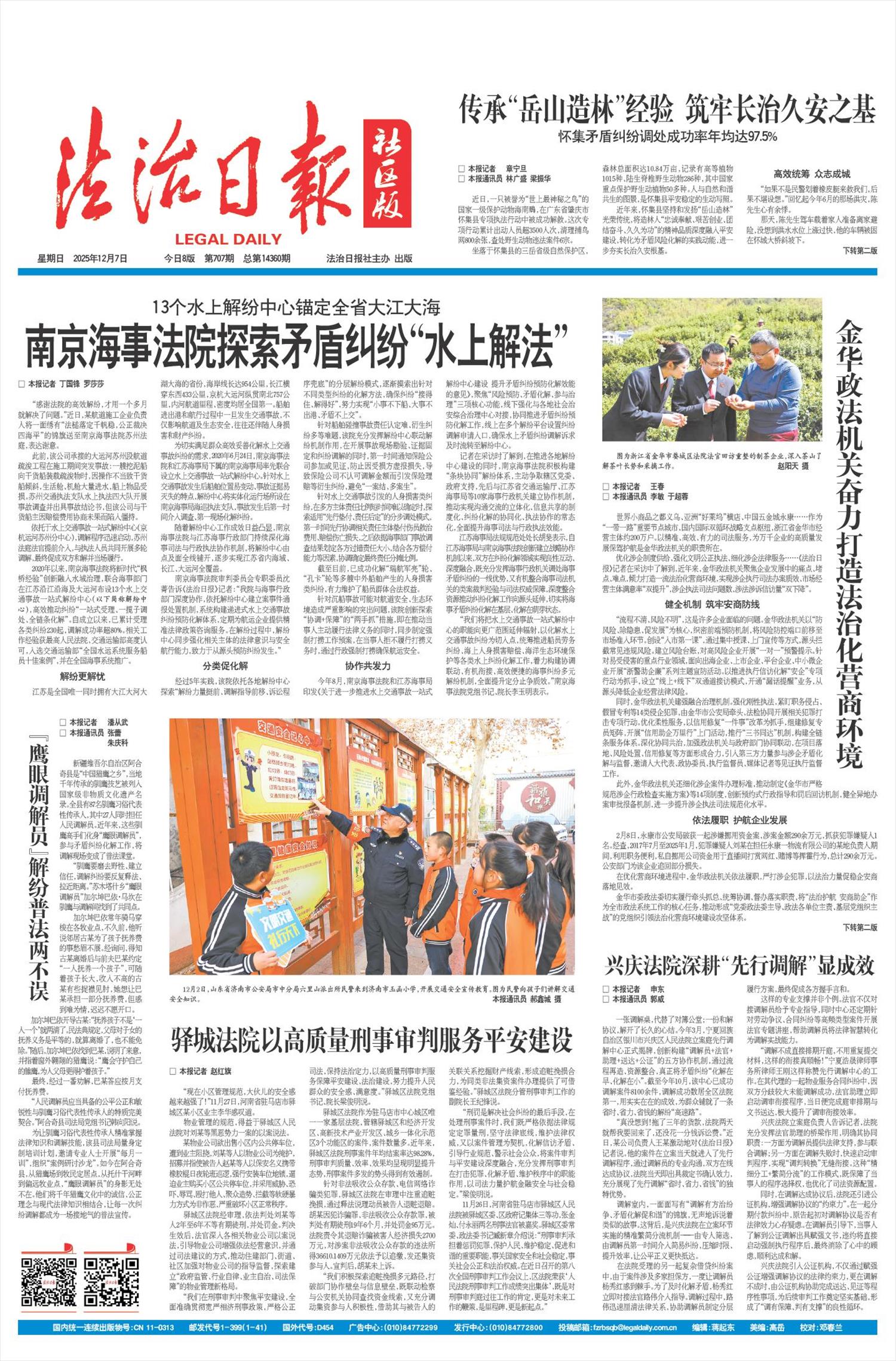 南京海事法院审判委员会专职委员沈菁告诉《法治日报》记者:“我院与海事行政部门深度协作,依托解纷中心建立案事件通报处置机制,系统构建递进式水上交通事故纠纷预防化解体系,定期为航运企业提供精准法律政策咨询服务。在解纷过程中,解纷中心同步强化相关主体的法律意识与安全航行能力,致力于从源头预防纠纷发生。”