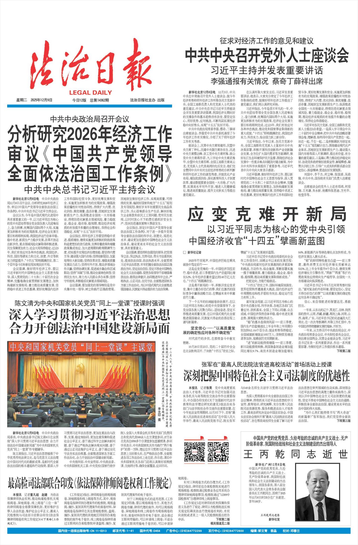 新华社北京12月8日电 中共中央政治局12月8日召开会议,分析研究2026年经济工作,审议《中国共产党领导全面依法治国工作条例》。中共中央总书记习近平主持会议。