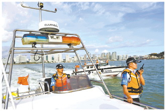 图为海南省三亚市公安局天涯分局三亚港海岸派出所民警近日对三亚港进出港航道进行巡逻防控和疏导。