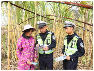 正值甘蔗丰收时节,连日来,江西省分宜县公安局交管大队组织民辅警走进辖区甘蔗种植基地,开展“美丽乡村行”交通安全宣讲活动,引导群众自觉摒弃交通陋习,安全文明出行。图为12月16日,民警在凤阳镇甘蔗种植基地向村民讲解交通安全知识。 本报记者 黄辉 本报通讯员 黄小军 摄