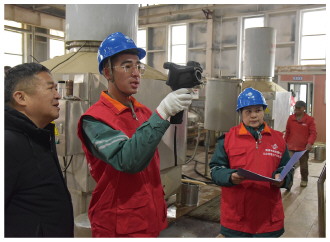 近日,国网奎屯供电公司共产党员服务队走进新疆西域酒业有限责任公司,对企业的生产车间、配电箱线路设备等进行“体检”。图为服务队队员使用红外测温仪识别设备温度异常区域,精准查找潜在隐患。