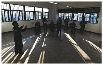 1月1日早7时,迎着新年的第一缕阳光,搬迁新址的上海提篮桥监狱新岸艺术团罪犯排练迎新春联欢晚会节目。