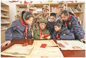 图为12月26日,93岁抗美援朝老兵曹宝济向小学生讲述红色故事。