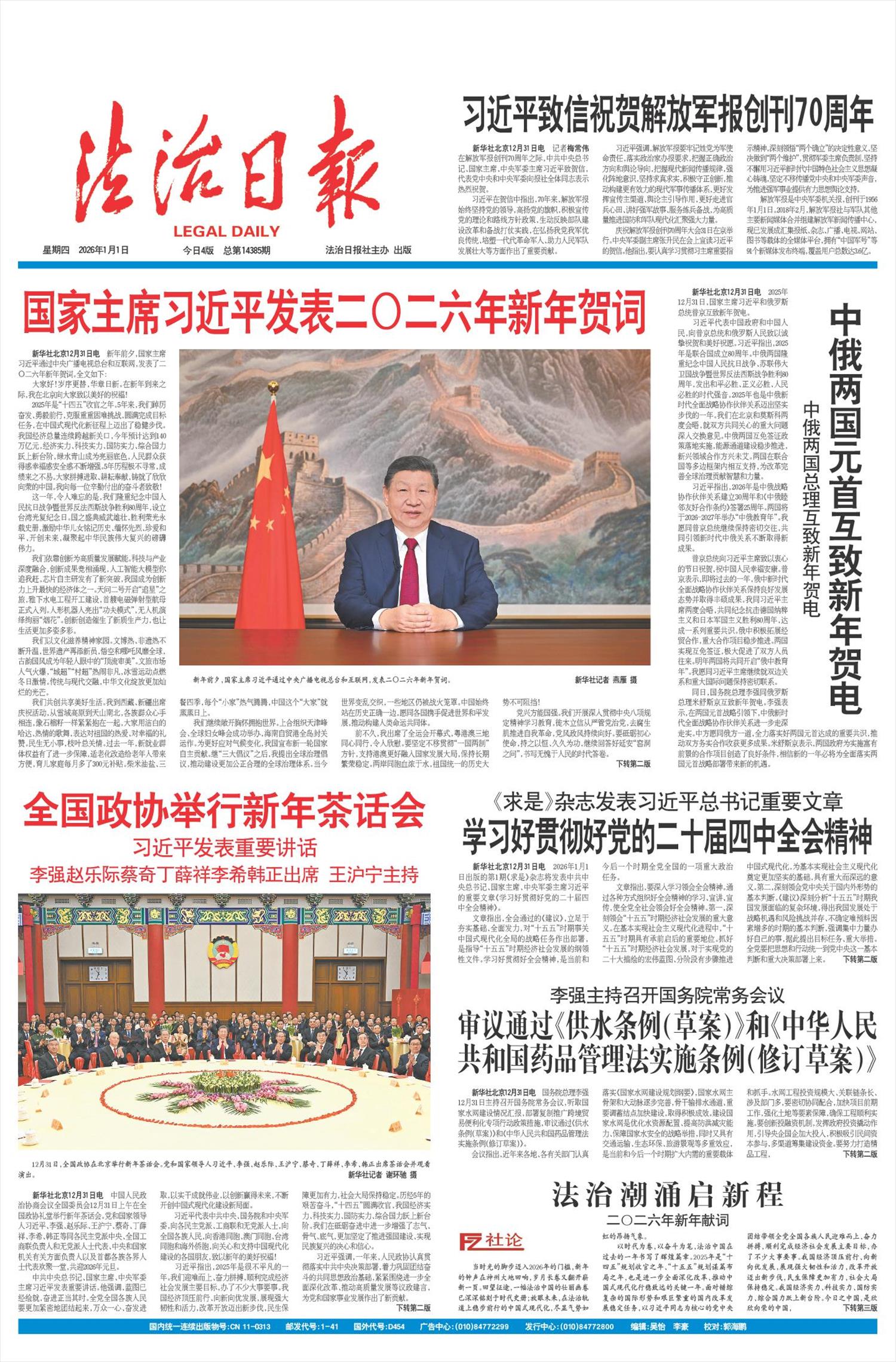以时代为卷,以奋斗为笔,法治中国在过去的一年书写了辉煌篇章。2025年是“十四五”规划收官之年、“十五五”规划谋篇布局之年,也是进一步全面深化改革、推动中国式现代化行稳致远的关键一年。面对错综复杂的国际形势和艰巨繁重的国内改革发展稳定任务,以习近平同志为核心的党中央团结带领全党全国各族人民迎难而上、奋力拼搏,顺利完成经济社会发展主要目标,办了不少大事要事。我国经济顶压前行、向新向优发展,展现强大韧性和活力,改革开放迈出新步伐,民生保障更加有力,社会大局保持稳定。我国经济实力、科技实力、国防实力、综合国力跃上新台阶。今日之中国,是欣欣向荣的中国,