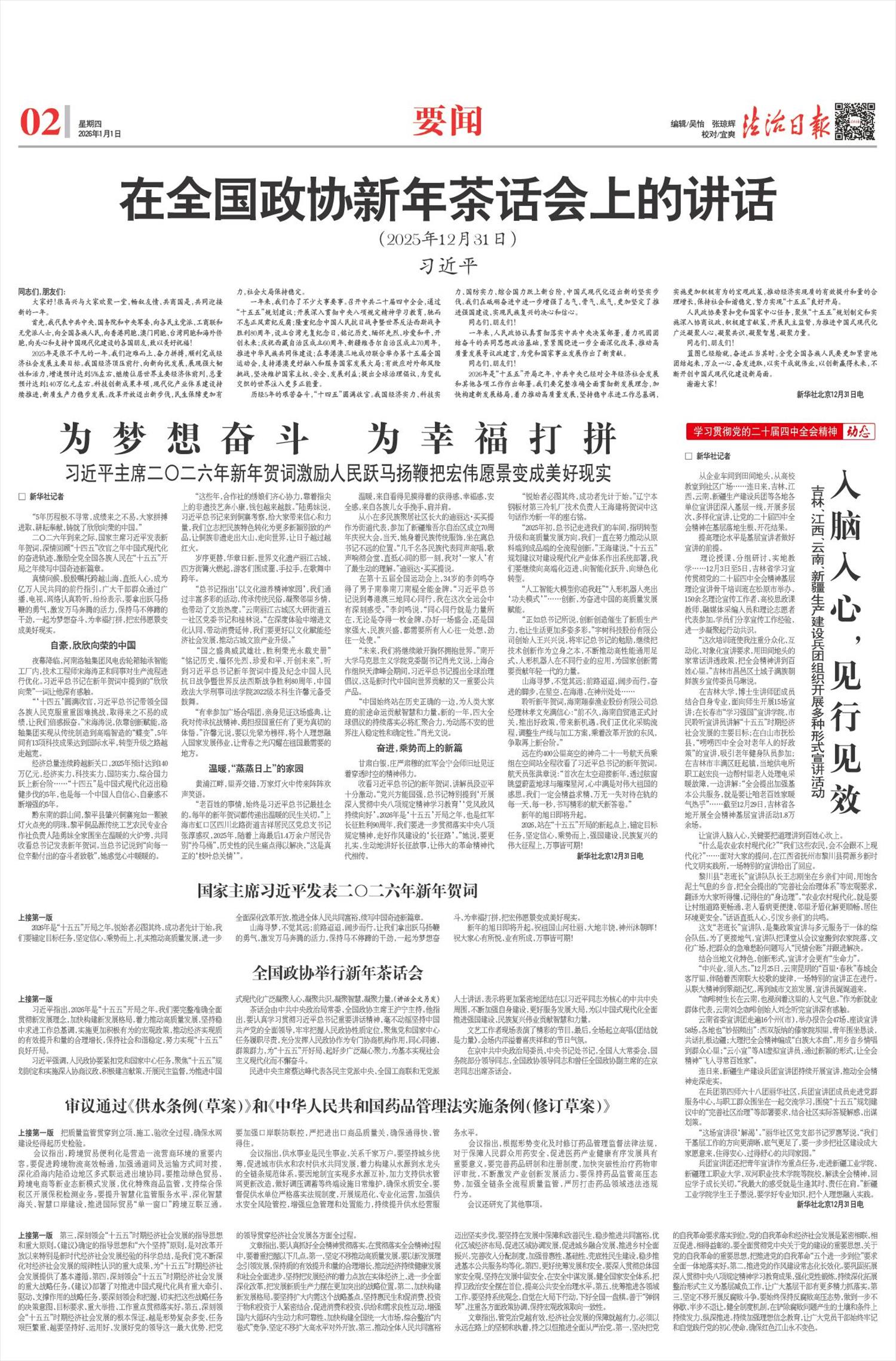 潮头登高再击桨,无边胜景在前方。党的二十届四中全会将“社会主义法治国家建设达到更高水平”列入“十五五”时期经济社会发展的主要目标。2026年,是“十五五”开局之年,也是基本实现社会主义现代化夯实基础、全面发力关键时期的起步之年。我们要自觉把思想和行动统一到党中央决策部署上来,深入贯彻落实党的二十届四中全会和中央全面依法治国工作会议精神,把学习贯彻习近平法治思想作为“纲”和“魂”融入全面依法治国各方面全过程,坚持党的领导、人民当家作主、依法治国有机统一,聚焦建设更加完善的中国特色社会主义法治体系、建设更高水平的社会主义法治国家,更加注重法治与改革、发展、稳定相协同,更加注重保障和促进社会公平正义,全面推进科学立法、严格执法、公正司法、全民守法,全面推进国家各方面工作法治化,以法治彰显和巩固制度优势,为以中国式现代化全面推进强国建设、民族复兴伟业提供有力法治保障。