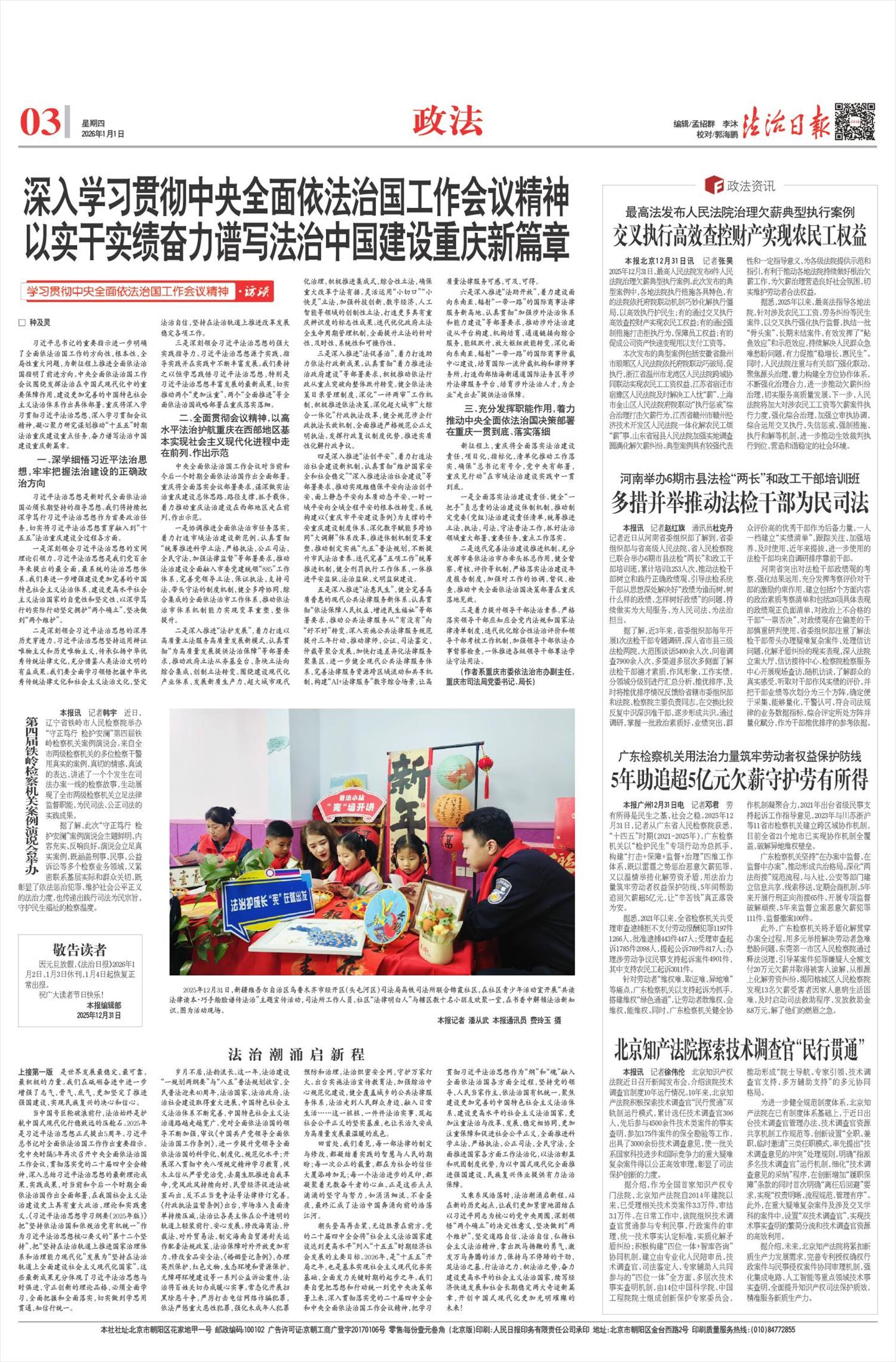 当时光的脚步迈入2026年的门槛,新年的钟声在神州大地回响,岁月长卷又翻开崭新一页。回望征途,一幅法治中国的壮丽画卷已深深铭刻于时代史册;放眼未来,在法治轨道上稳步前行的中国式现代化,尽显气势如虹的昂扬气象。