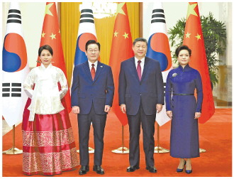 一月五日下午,国家主席习近平在北京人民大会堂同来华进行国事访问的韩国总统李在明举行会谈。这是会谈前,习近平和夫人彭丽媛同李在明和夫人金惠景合影。