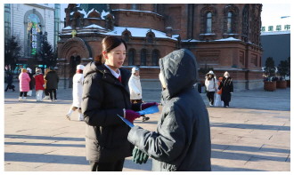 图② 近日,黑龙江省哈尔滨市道里区人民法院把“涉旅维权宣传站”变为“流动的普法课堂”,让游客们在欣赏冰雪美景的同时,学习法律知识。图为法官在景区发放如何解决涉旅纠纷的普法宣传单。