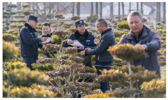 图③ 近日,上海市公安局崇明分局竖新派出所民警来到辖区“瓜子黄杨”种植基地开展安全走访和普法宣传,为乡村特色产业发展保驾护航。图为民警向种植户讲解法律知识。
