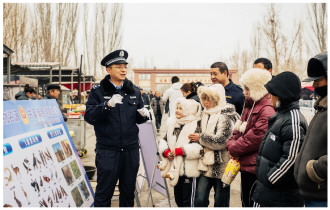 ▲ 近日,新疆维吾尔自治区新和县公安局环资食药大队民警深入辖区巴扎,把野生动植物保护和食品安全相关法律知识送到群众身边。图为民警宣讲野生动植物保护法律知识。 本报记者 潘从武 本报通讯员 丁志远 摄