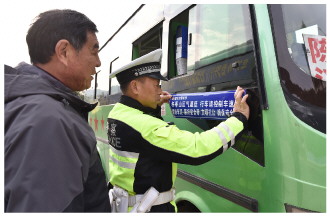 图③ 近日,安徽省宿松县公安局交通管理大队深入山区乡镇对农村客运班线进行安全检查,确保车辆安全出行。图为民警在客运车辆上张贴冬季安全提示标识。