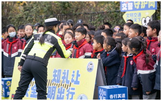图① 近日,由江苏省南京市委宣传部、市公安局、市教育局联合举办的“平安南京 ‘警’彩‘童’行”活动在南京岱山实验小学举行,8大警种200余名民警开展各具特色的主题活动,向校内1200余名师生普及安全文明出行知识。图为学生参与交通安全小课堂问答活动。