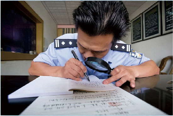 1965年9月出生,现为海南省昌江黎族自治县公安局党委委员、副政委。1999年,他在与持枪劫匪的战斗中负伤,导致右眼失明,左眼视力仅为0.02。至今,他的双眼和胸部仍有10多粒铁砂无法取出。负伤后,黎定琦原本可以调到相对轻松的岗位,但他不愿“躺在功劳簿上过生活”。干好刑警,侦破案件,仍然是他最想干的事。2008年,黎定琦被授予“全国公安系统一级英雄模范”。图为因视力所限,黎定琦在日常工作中必须借助放大镜看材料。