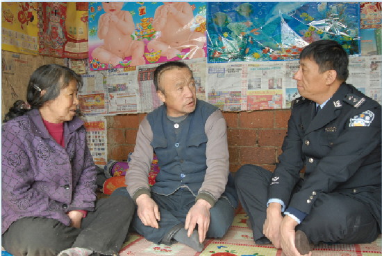 1968年8月出生,生前任黑龙江省哈尔滨市公安局阿城分局原党组副书记、松峰山派出所所长。在担任哈尔滨市阿城区松峰山派出所所长期间,他22年如一日服务山区群众,不断坚定“为山村百姓创造稳定和谐环境、改变贫困山区落后面貌”的信念,始终坚持“紧紧依靠群众、处处服务群众、事事为群众着想”的理念,与人民群众结下了深厚的手足之情,成为山村群众的贴心人。2010年被授予“全国公安系统一级英雄模范”。2013年5月2日,王影因病医治无效逝世。图为2008年10月30日傍晚,王影(右)来到三清村一户村民家调解邻里矛盾。 潘国忠 摄