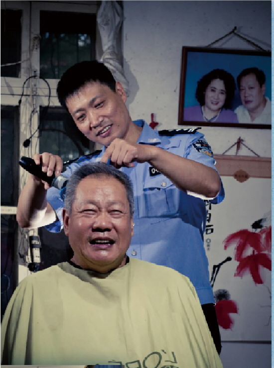 1965年6月出生,生前系北京市公安局丰台分局蒲黄榆派出所社区民警兼东铁匠营街道蒲黄榆第二社区党委副书记。从警34年,刘安始终扎根社区,以饱满的工作热情和强烈的责任感践行雷锋精神。他组织社区各行各业人员成立“社区爱民服务团队”;长年悉心照料辖区69位孤寡、空巢老人;资助偏远地区的28名贫困儿童,用心血、汗水和生命演绎了扎根基层、爱民为民的华彩篇章。2021年3月7日,刘安在工作岗位上突发疾病,抢救无效因公殉职。同年,刘安被追授“全国公安系统一级英雄模范”。图为刘安生前为辖区内一位无法出门的老人提供上门理发服务。