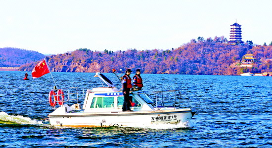 近年来,安徽省舒城县公安局创新打造生态警务模式,严厉打击破坏生态环境的违法犯罪行为,全力保护辖区生态环境。图为近日,万佛湖旅游度假区派出所组织警力在湖面巡航。