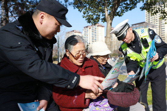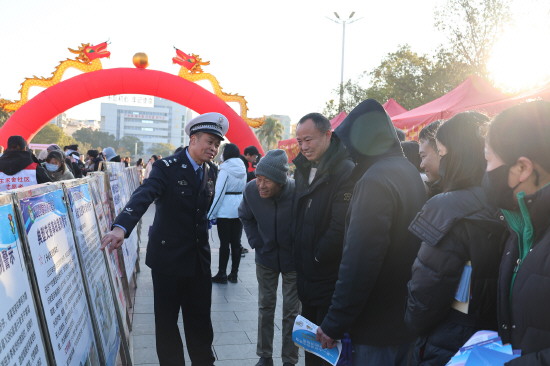 图② 近日,陕西省富平县公安局组织基层派出所民辅警在全县范围内开展“四十载守护平安·110勇毅前行”主题宣传活动,向群众发放安全防范相关法治宣传资料。图为民辅警向群众讲解安全防范知识。