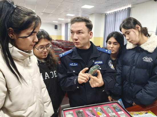 图② 新疆维吾尔自治区巴楚县公安局禁毒大队近日组织警力深入辖区车站、学校等多个人流密集区域,开展禁毒宣传活动。图为巴楚县公安局禁毒大队辅警在辖区学校开展禁毒知识宣传。