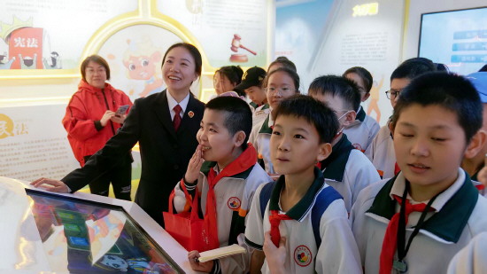 图① 近日,内蒙古自治区包头市昆都仑区第一实验小学学生走进昆都仑区人民检察院青少年法治教育基地,参加了一场生动的法治宣传教育课。图为同学们在检察官引导下学习法律知识。