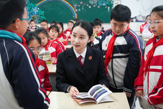 图③ 江苏省扬州市邗江区人民检察院近日组织检察官走进扬州市邗江区实验学校,为师生送上由该院编著的《成语里的法律智慧》普法书。图为检察官向学生们讲解普法书内容。