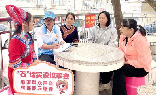图为广西壮族自治区南宁市良庆区大沙田街道三叠石片区人大代表联络站依托“石”话实说平台深入各族群众征集立法意见建议。
